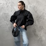 Рубашка выполнена из плотного хлопка. Имеет объёмный воротник с рюшей.